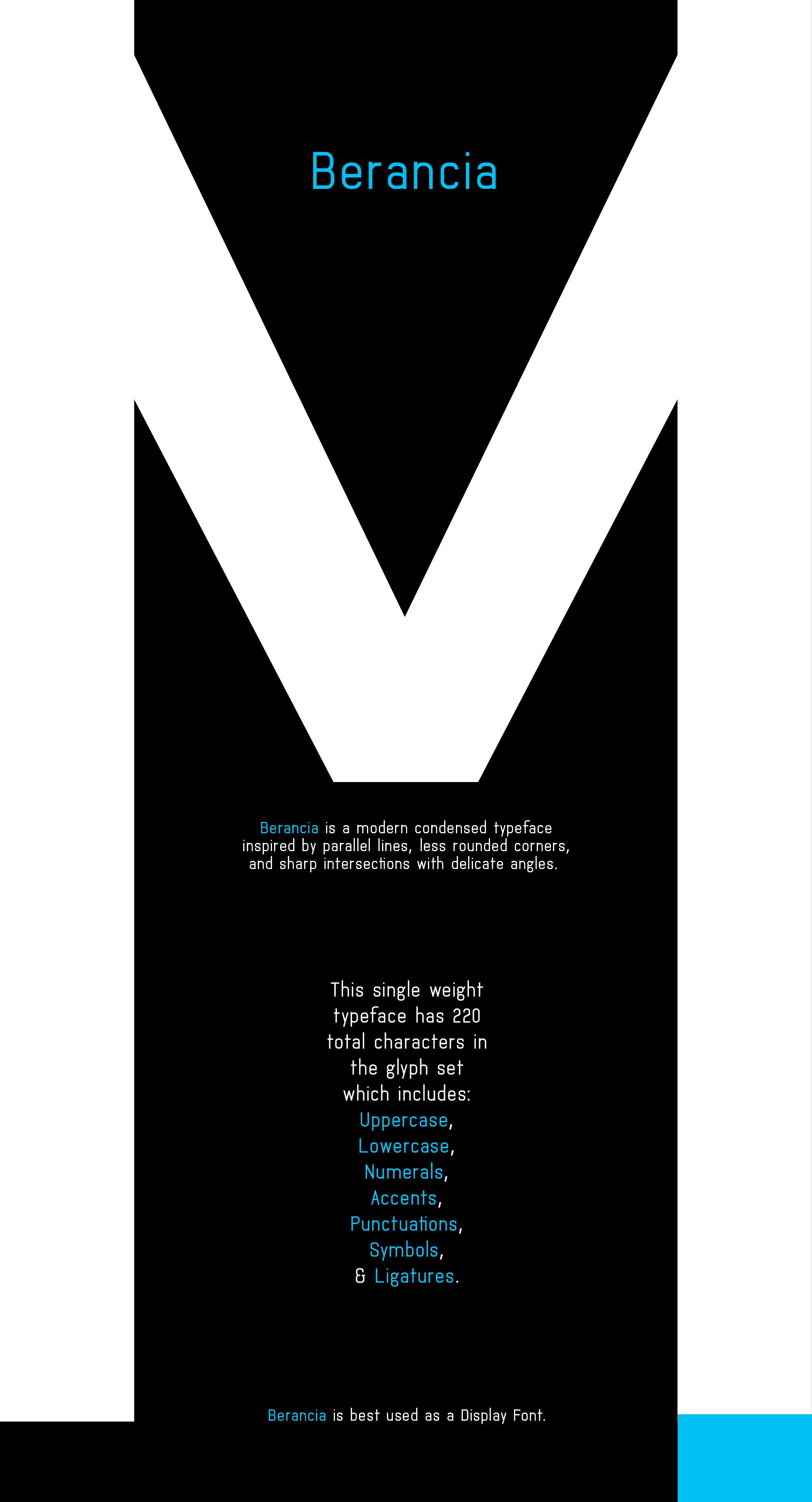 The Berancia font was inspired by clean, simple, and modern infrastructures that surrounds us in our daily lives. It is a modern condensed typeface that is strong and unified in its construction, with parallel lines, sharp angles with delicate corners. The single typeface contains over 220 characters.