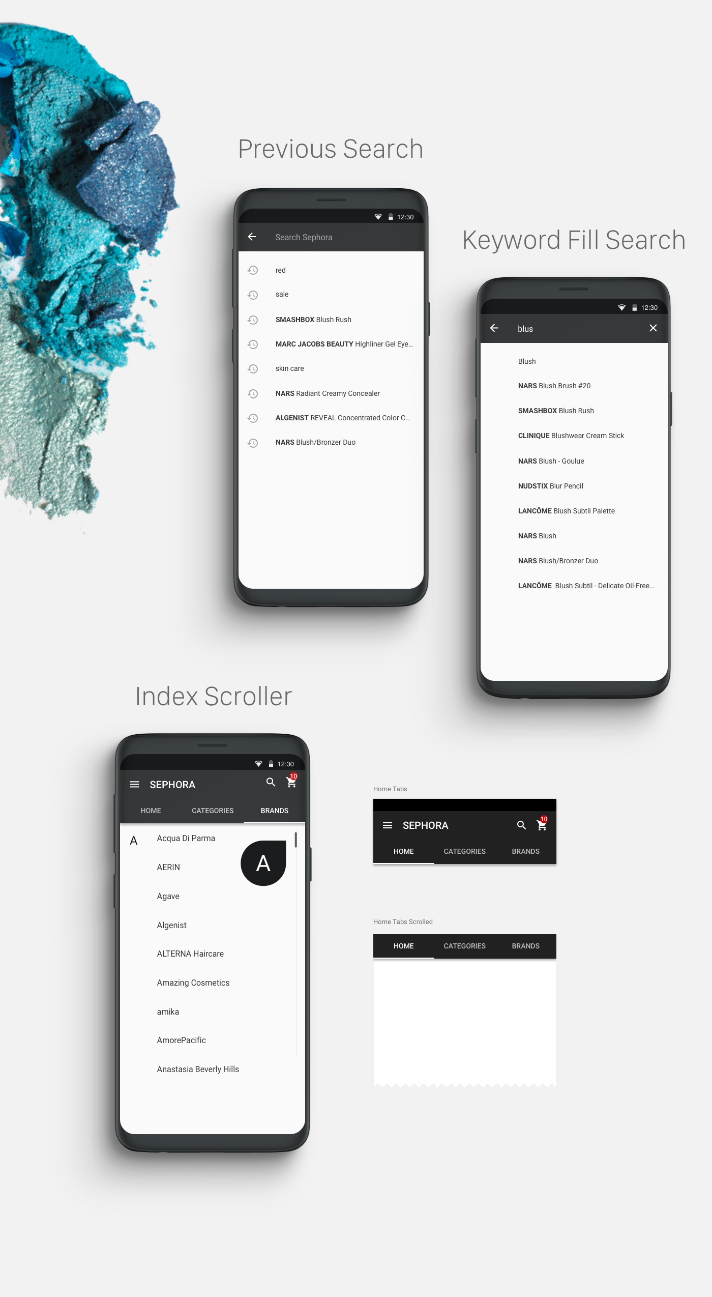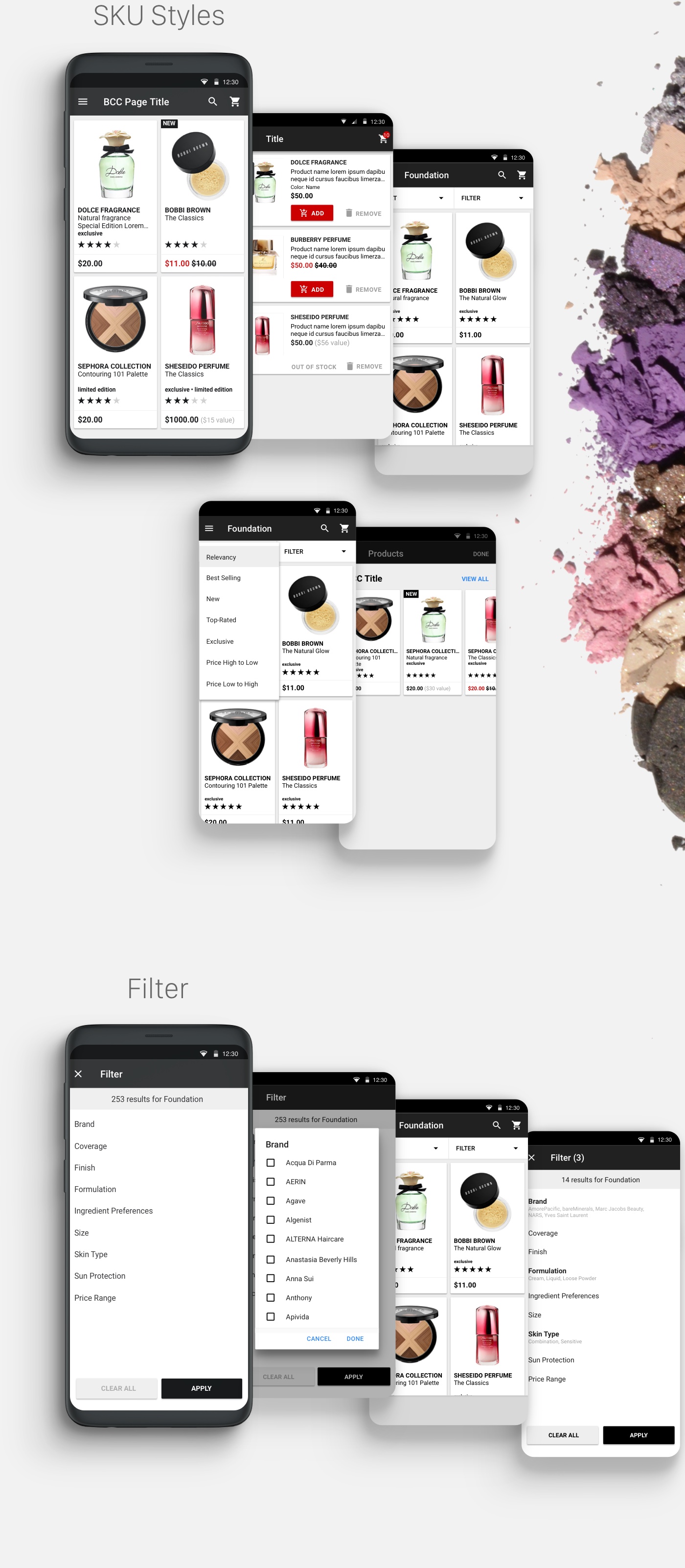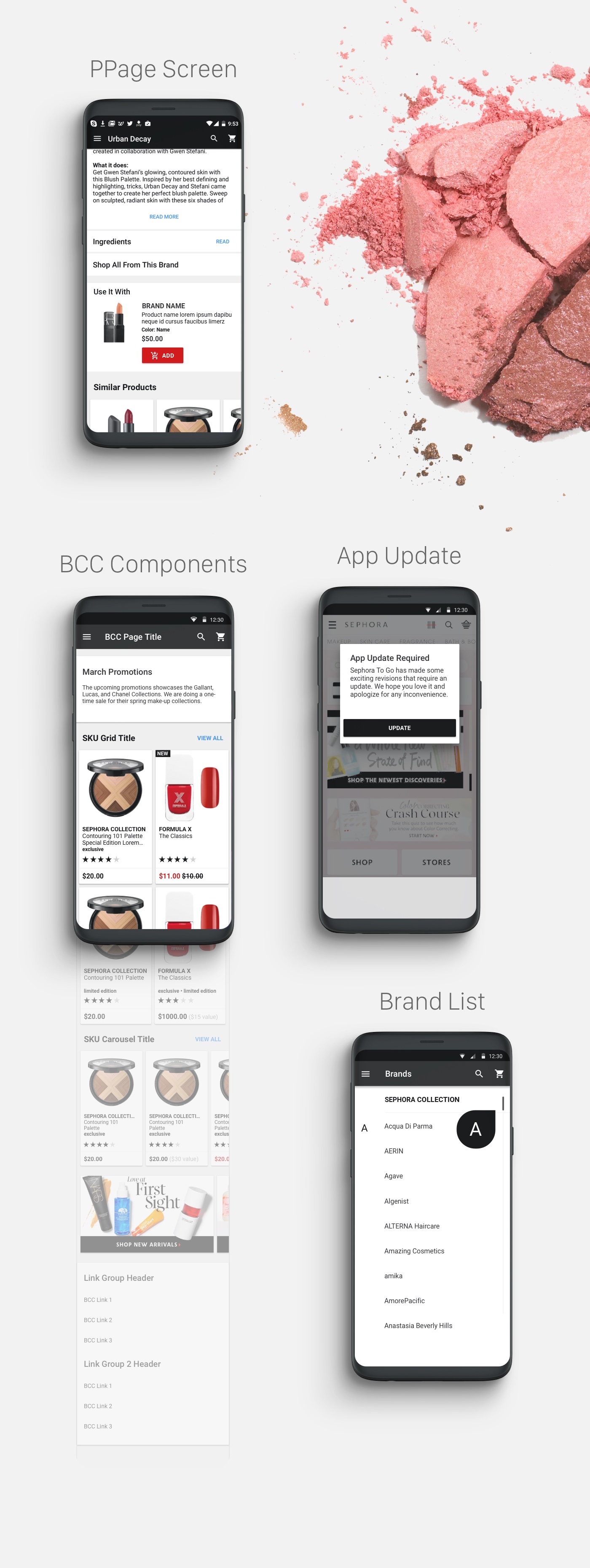 The goal was to implement a simpler and up-to-date look overall. I also included visuals of Sephora products in the background to give it an organic feel. The most important design element that I wanted to incorporate was the card style, which separates and gives the content elements more readibility, space, and organization.