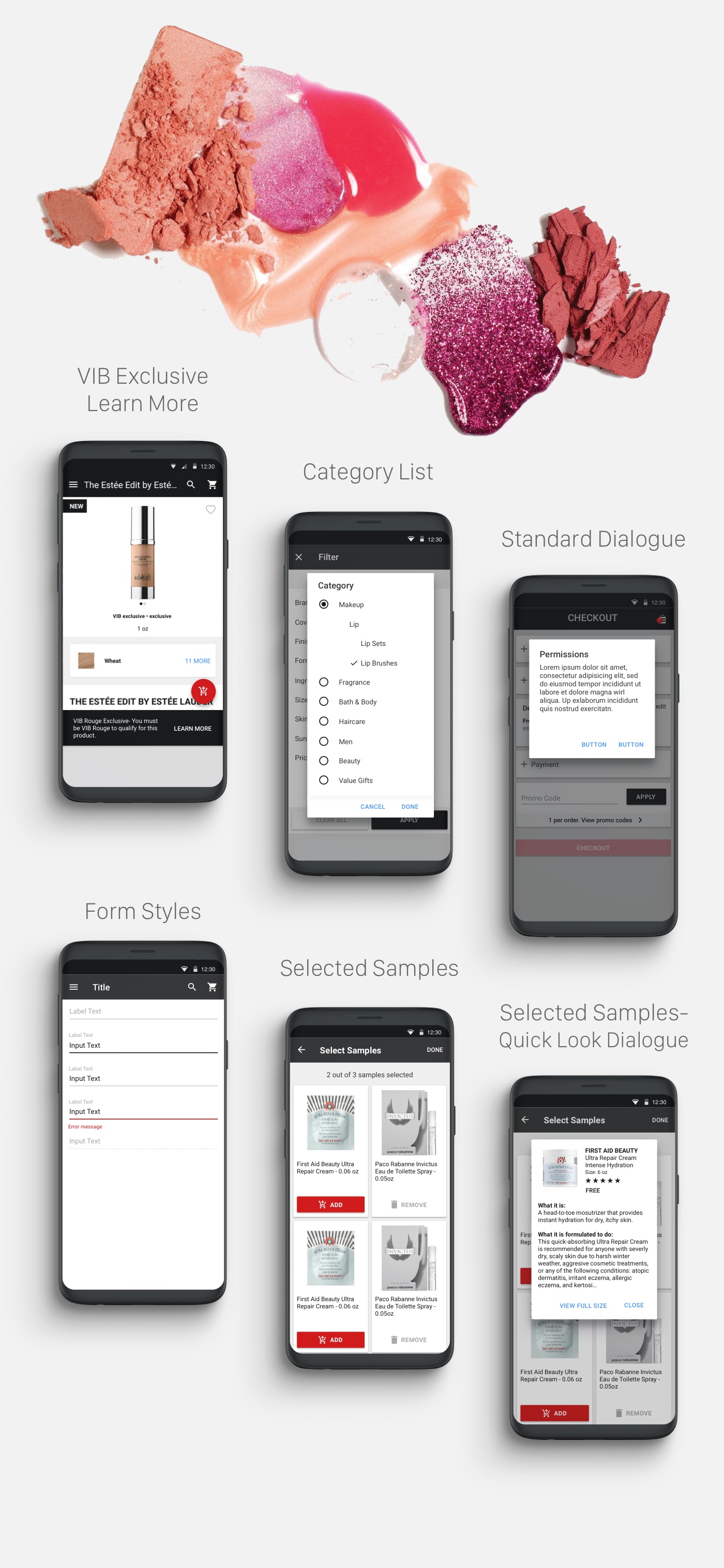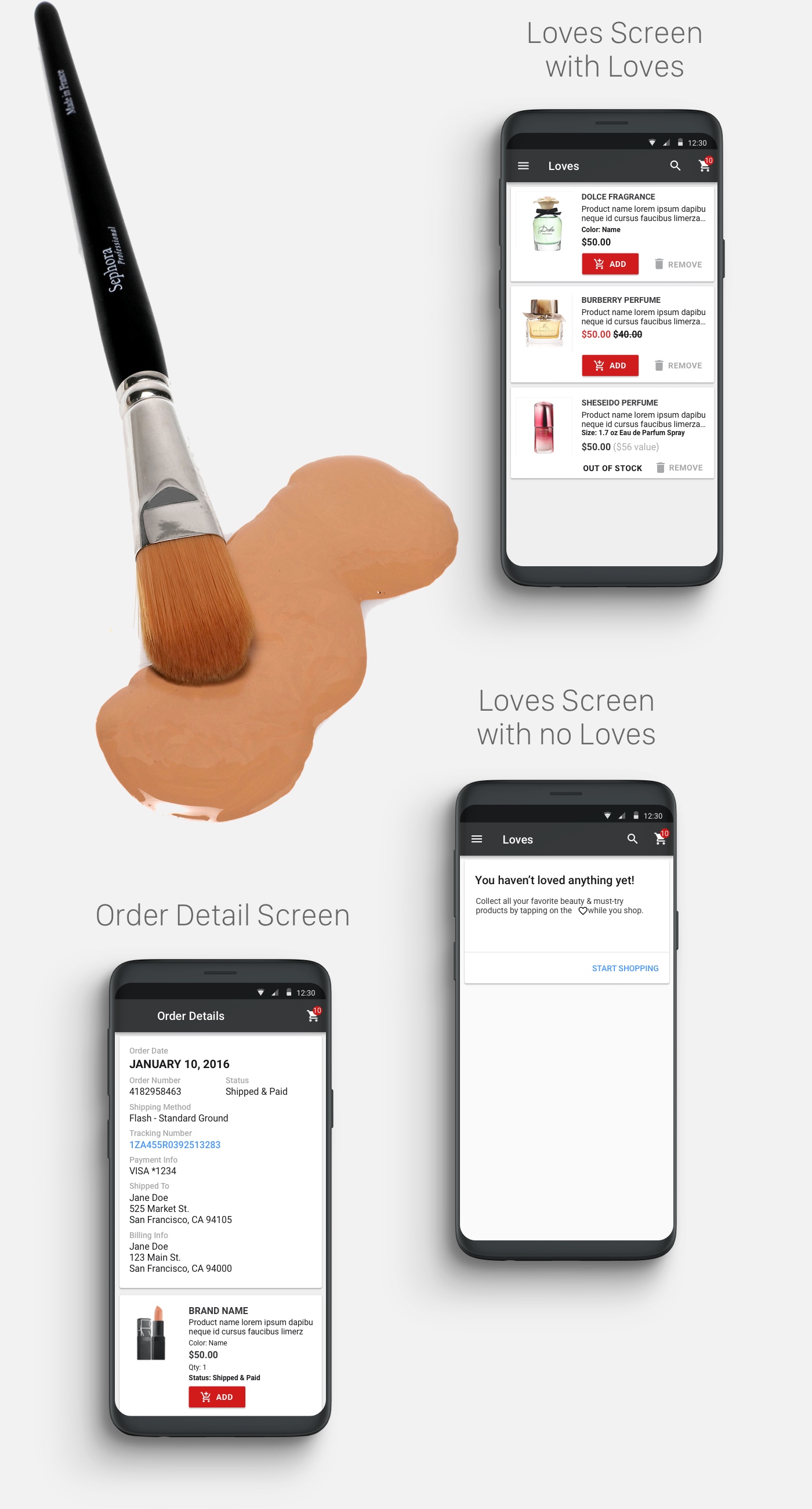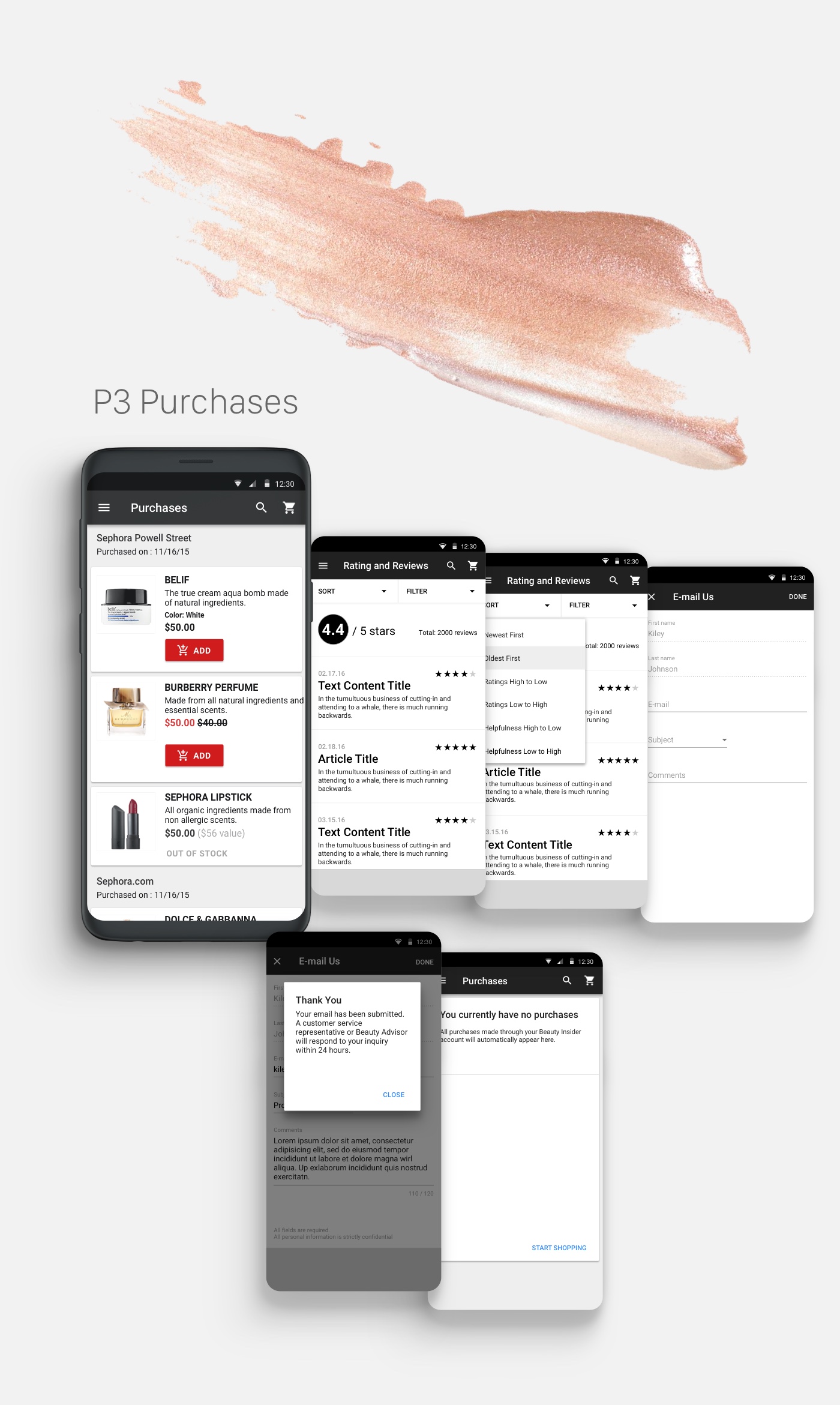 The goal was to implement a simpler and up-to-date look overall. I also included visuals of Sephora products in the background to give it an organic feel. The most important design element that I wanted to incorporate was the card style, which separates and gives the content elements more readibility, space, and organization.