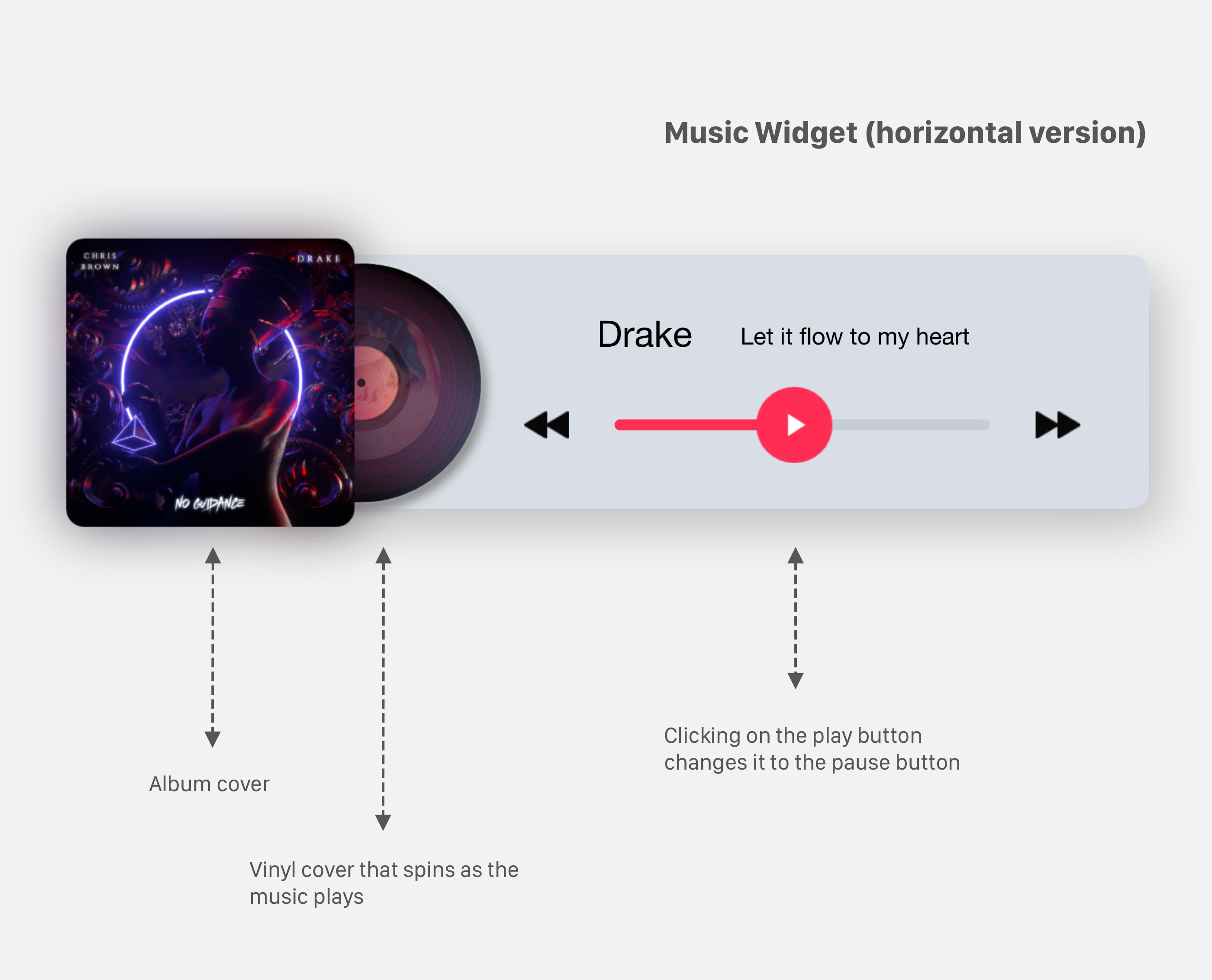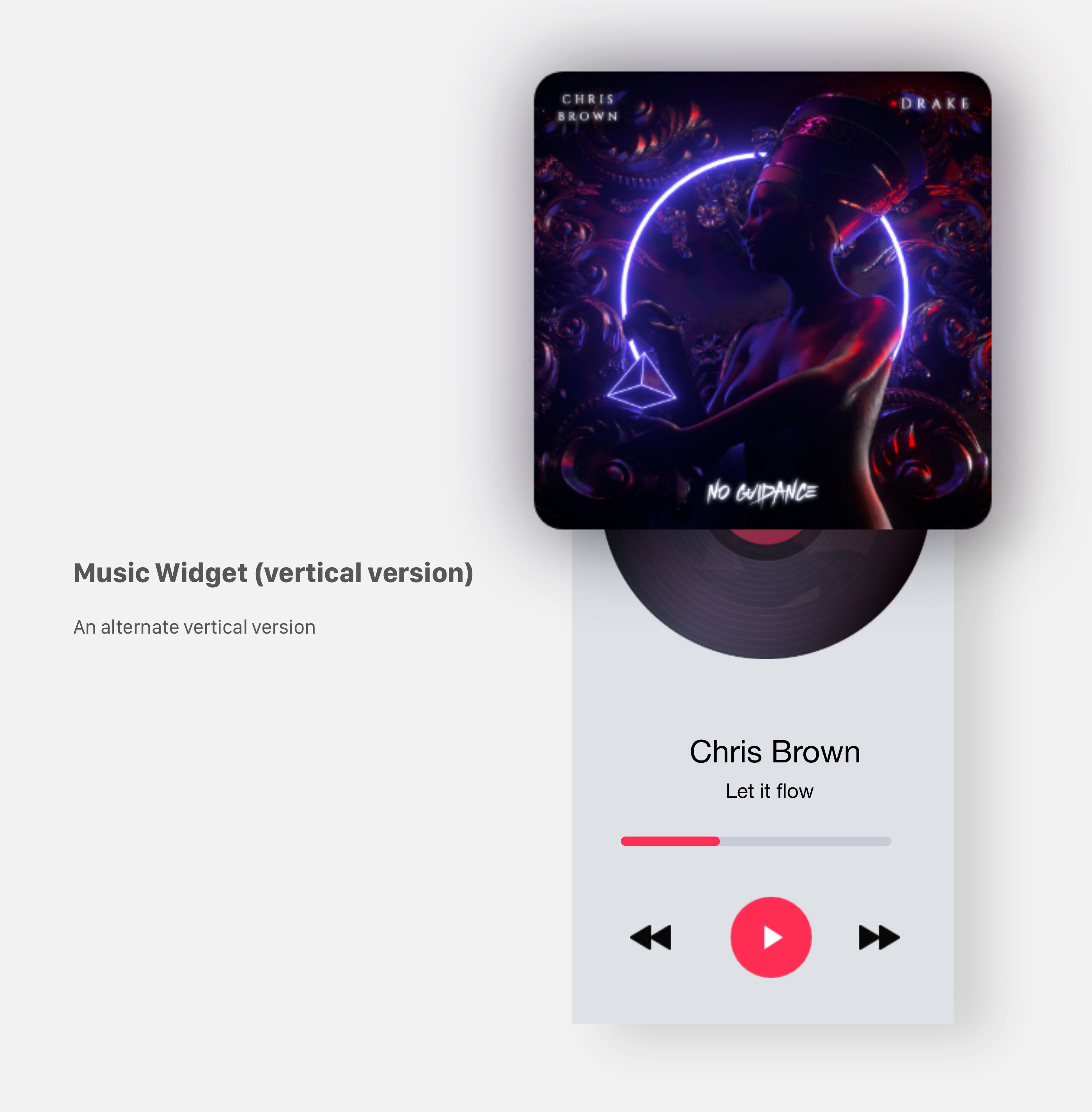 I've always wanted to design a nice, sleek music widget ever since Apple came out with their itunes desktop app. With mine, I streamlined a few things and added a rotating vinyl album emulating a turntable (for those who grew up in that era that appreciates old school music), as well as the album cover. One extra addition was to combine the play button with the progression bar.