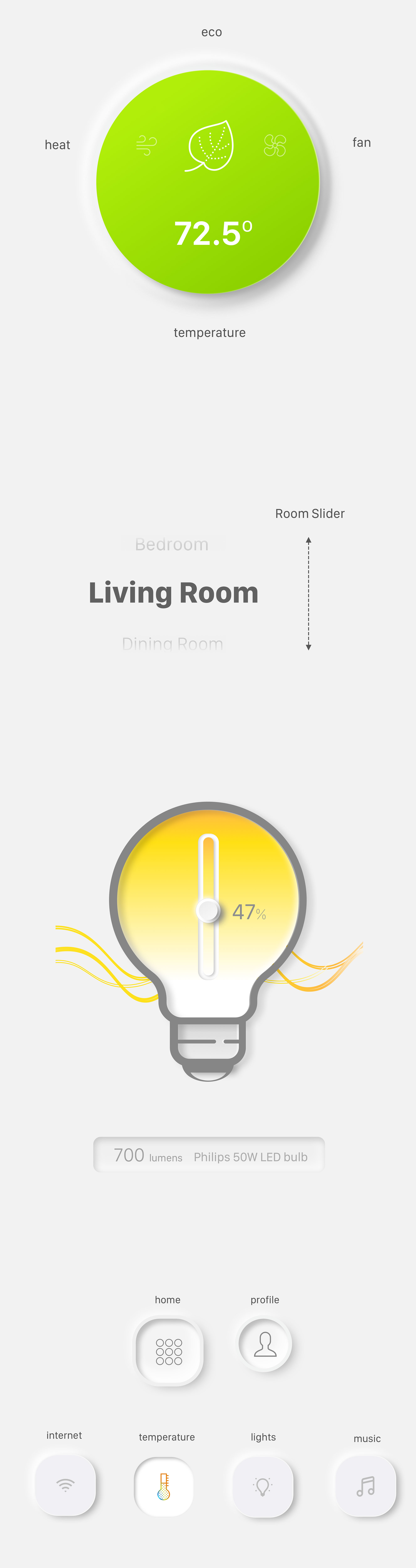 Thermometers have been around for years. You turn it on and choose your settings for your home. With this concept, the idea was simple, instead of turning and adjusting your knob with your wrist, it's more of a simple swipe or click to select your temperature setting. The temperature shows the change as you swipe left tor right and you're all set to go. Now you can go back to your day and enjoy your daily routine with the right room temperature. Easy peazy!