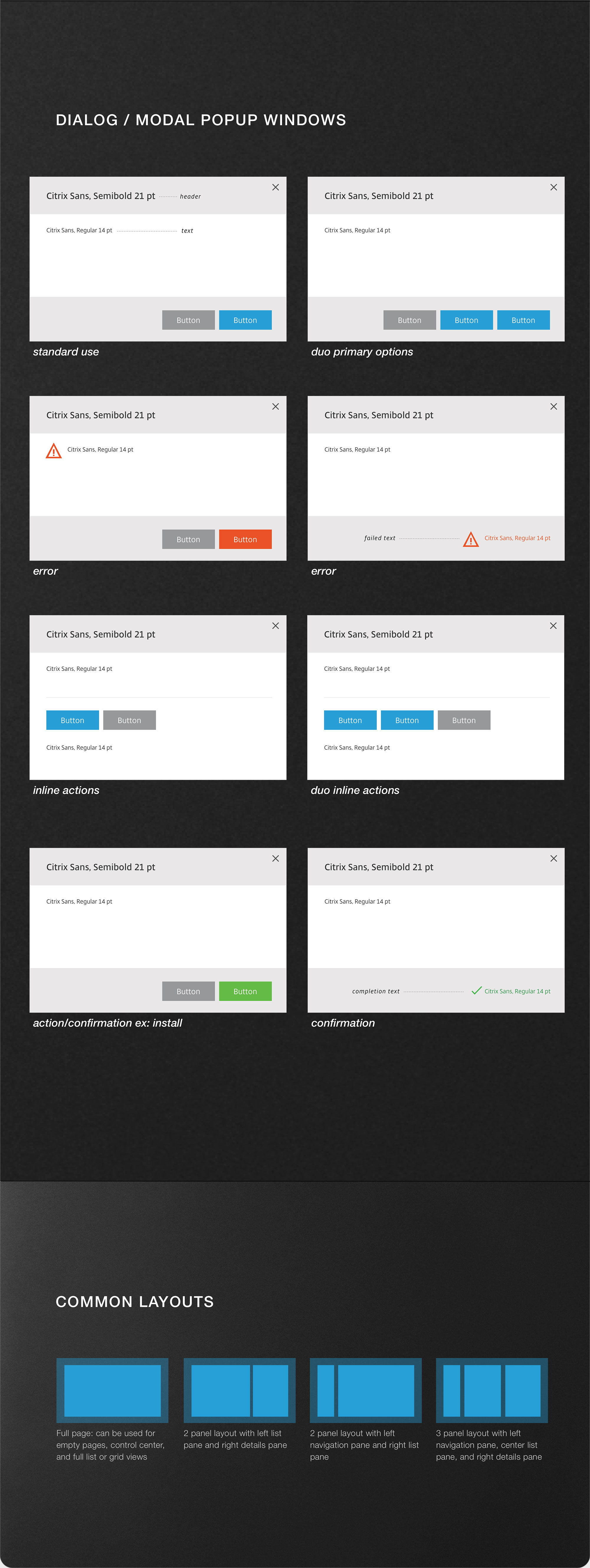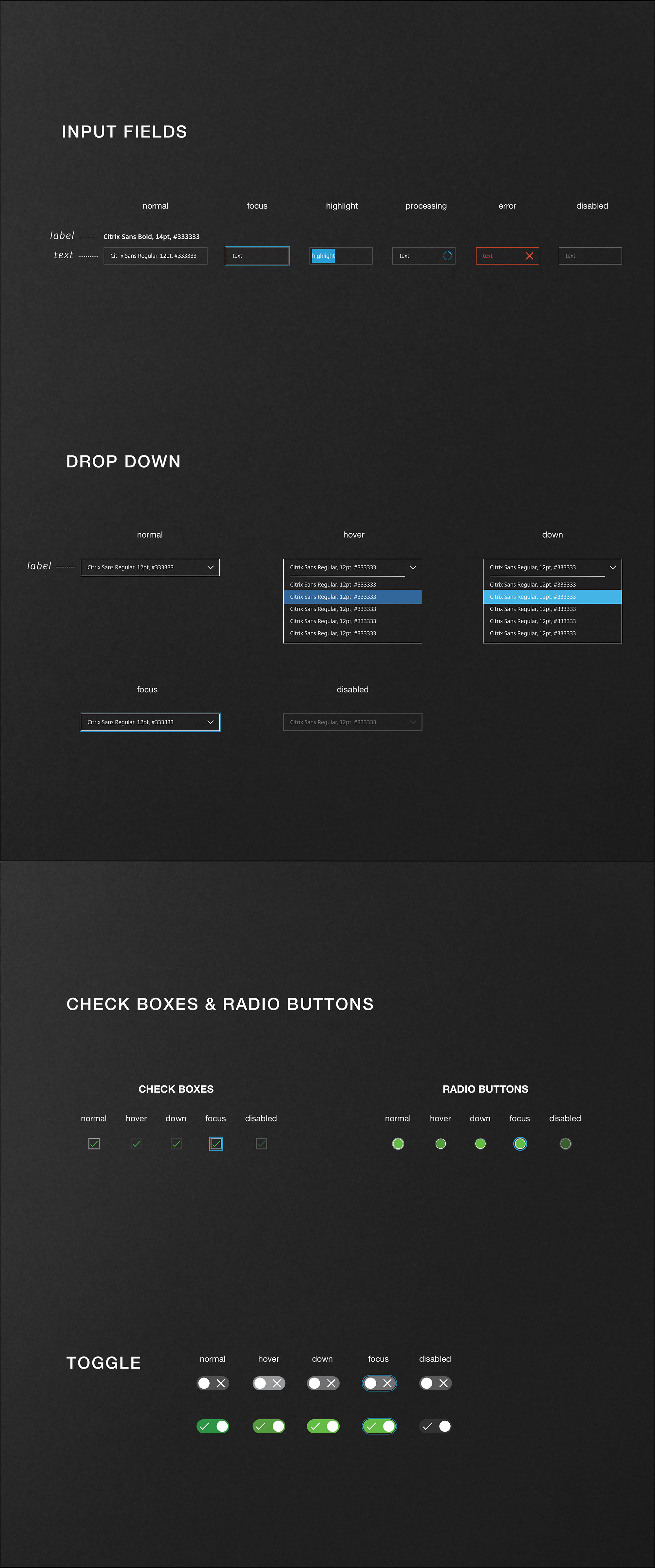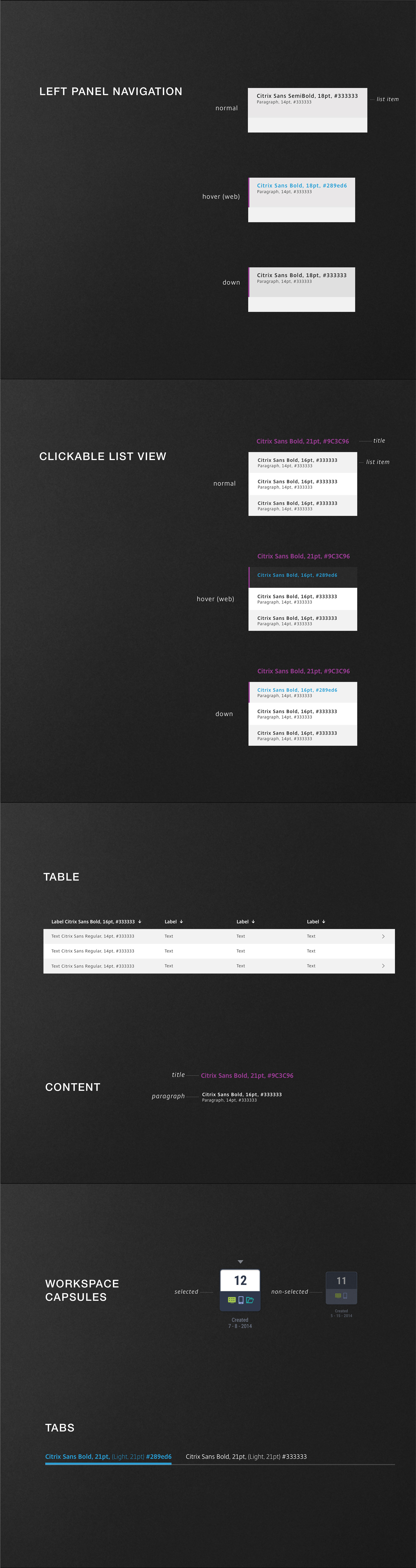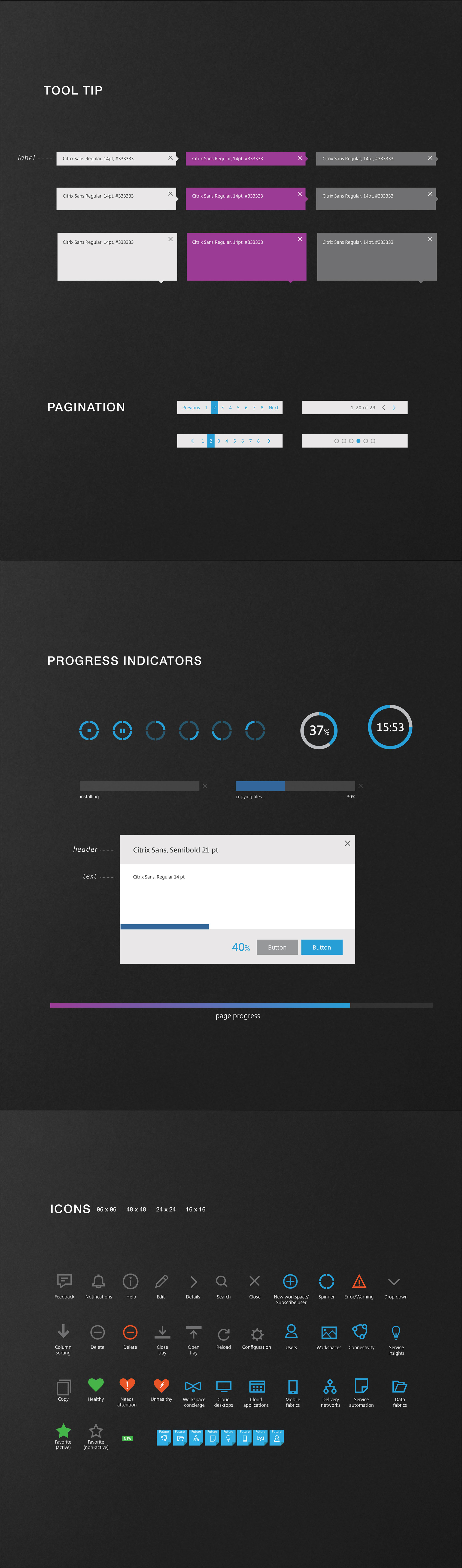 The Citrix Design Systems was created to keep an accurate documentation of the creative common components patterns as the web appliacation was built out. The substance of colors to icons was a showcase of how each element played a part in the scale of the look and feel of the Citrix Design Systems.
