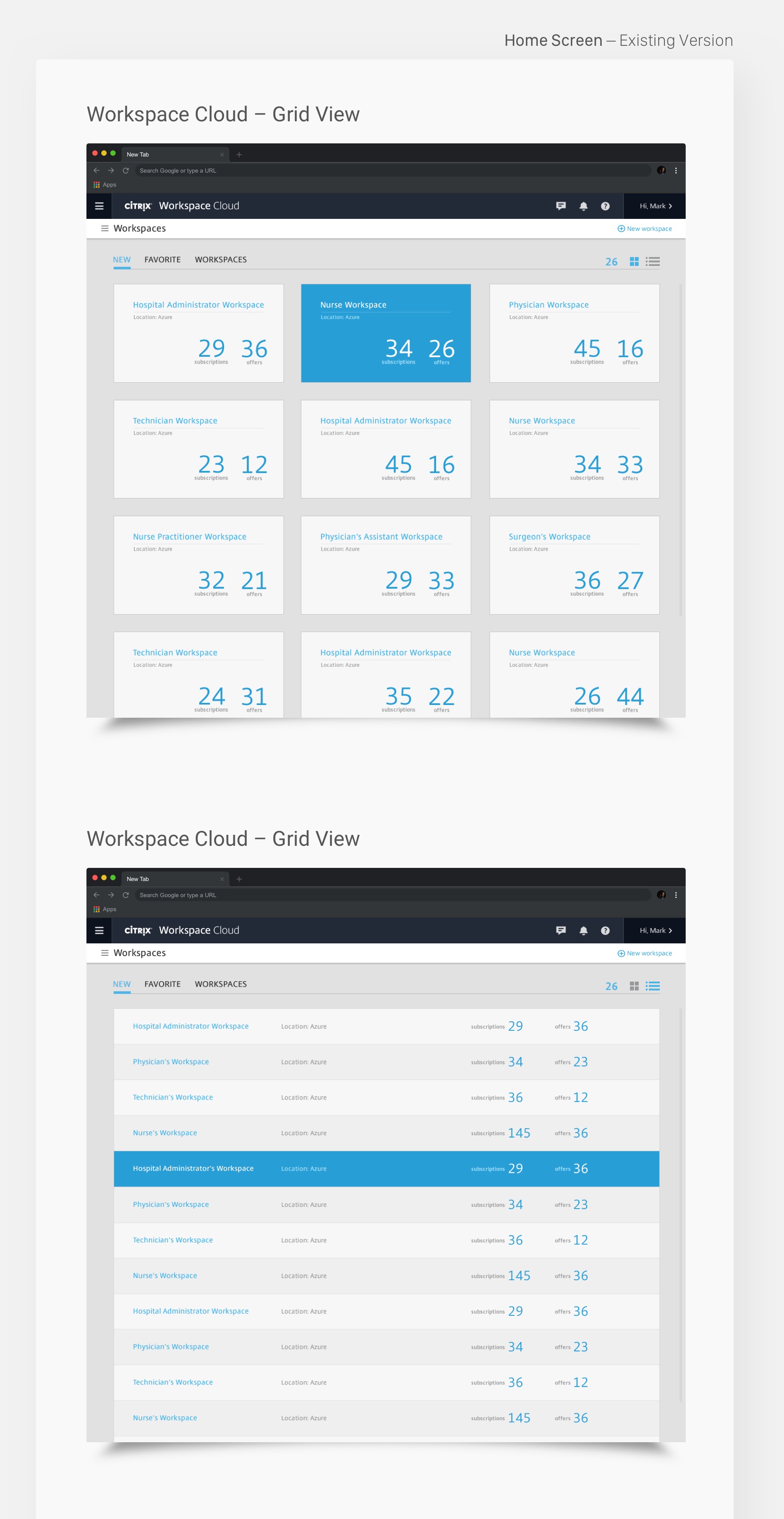 The Workspaces & Offerings Views provide variable ways to view your workspaces. The first view is the Card Layout view which organizes the information in card form. The second view is the List View which is more appropriate for long lists, and the last view is with multiple categories in a list view with subcategories.
