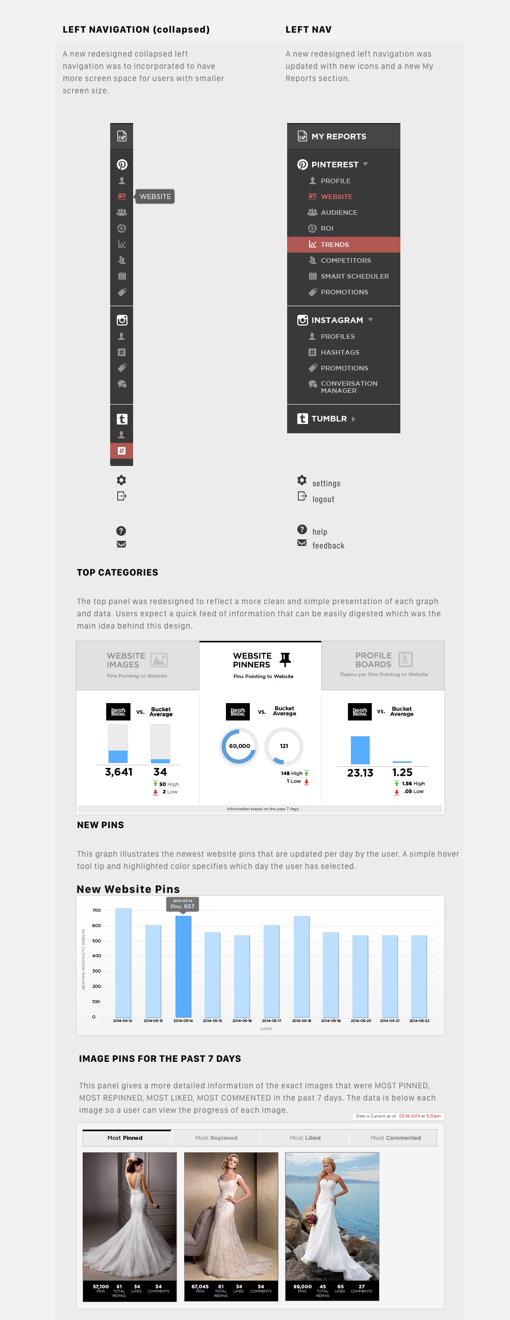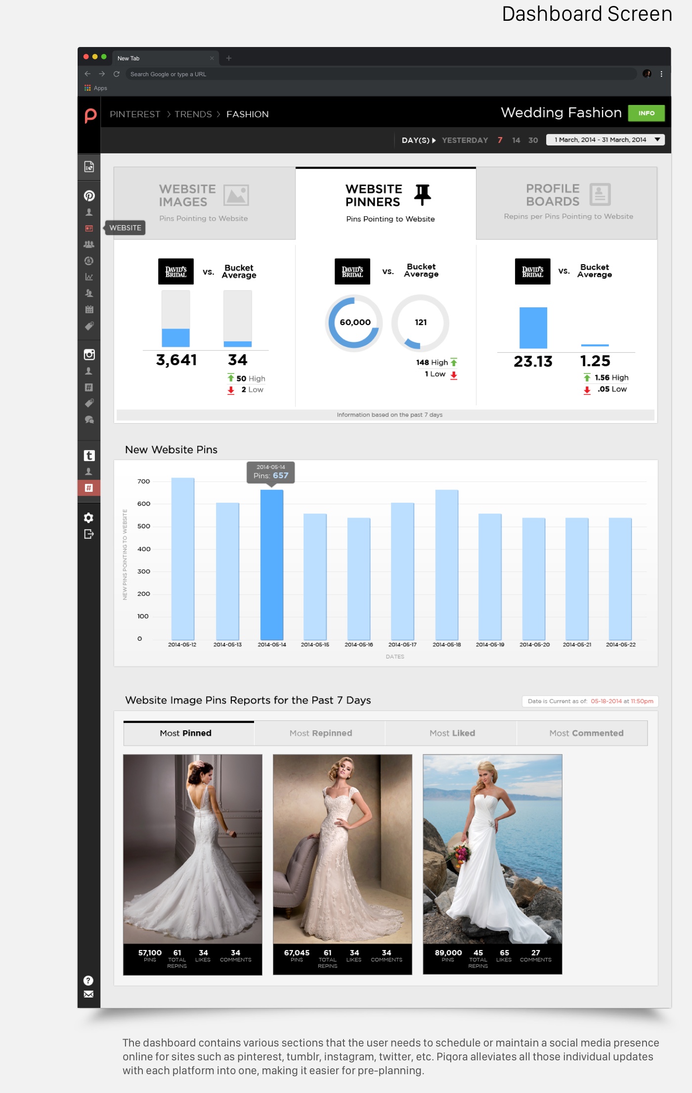The Piqora dashboard displays data and analytics for website pinners, website images, and profile boards. It compares the user's analytics to the bucket average which they can leverage for promotions and sweepstakes. It also shows website pins and website pins reported in the last 7 days. The visual approach was to keep the information clean and simple to read.