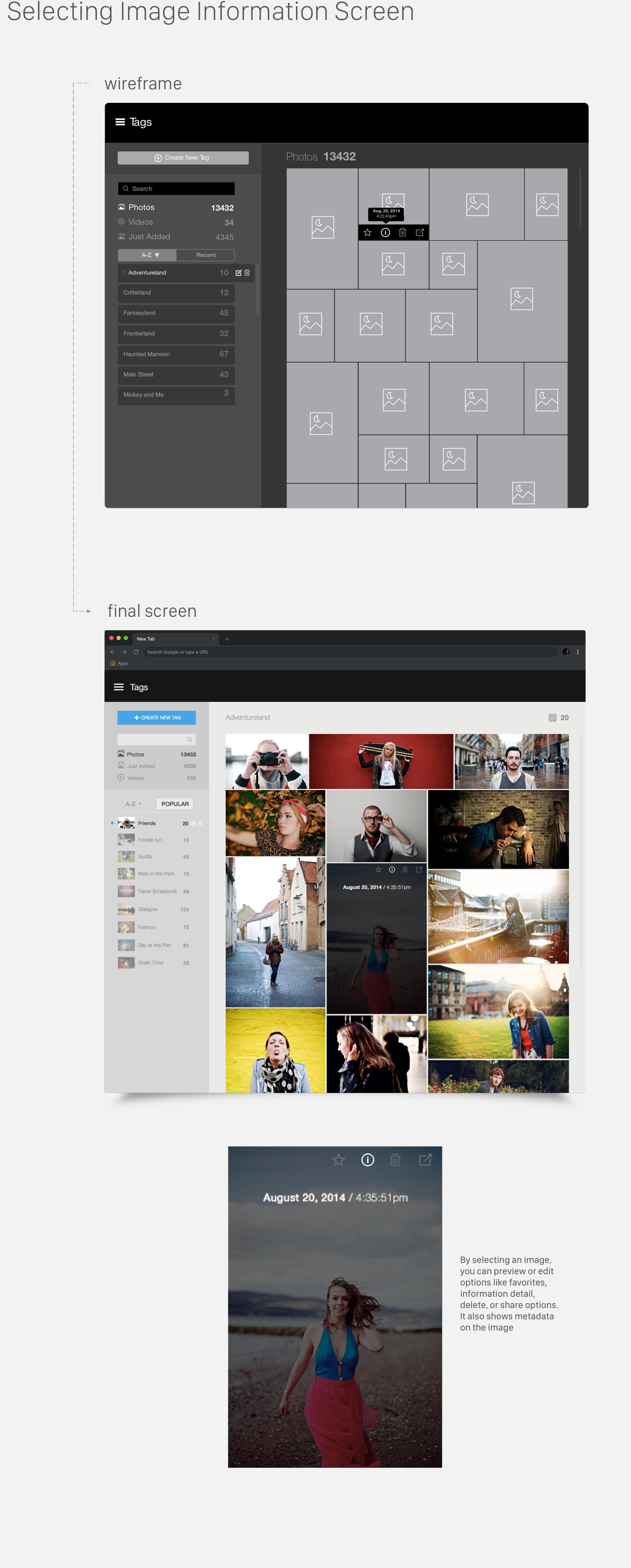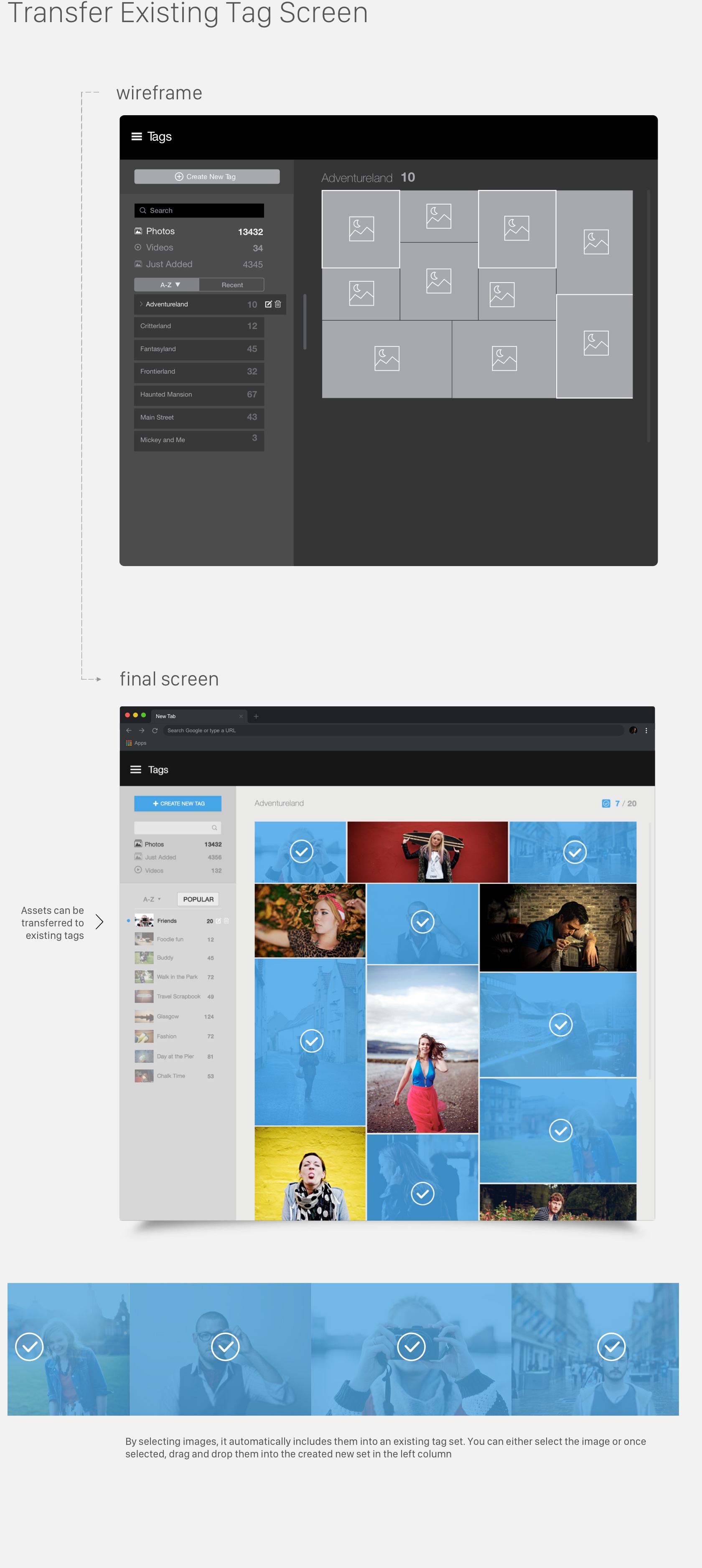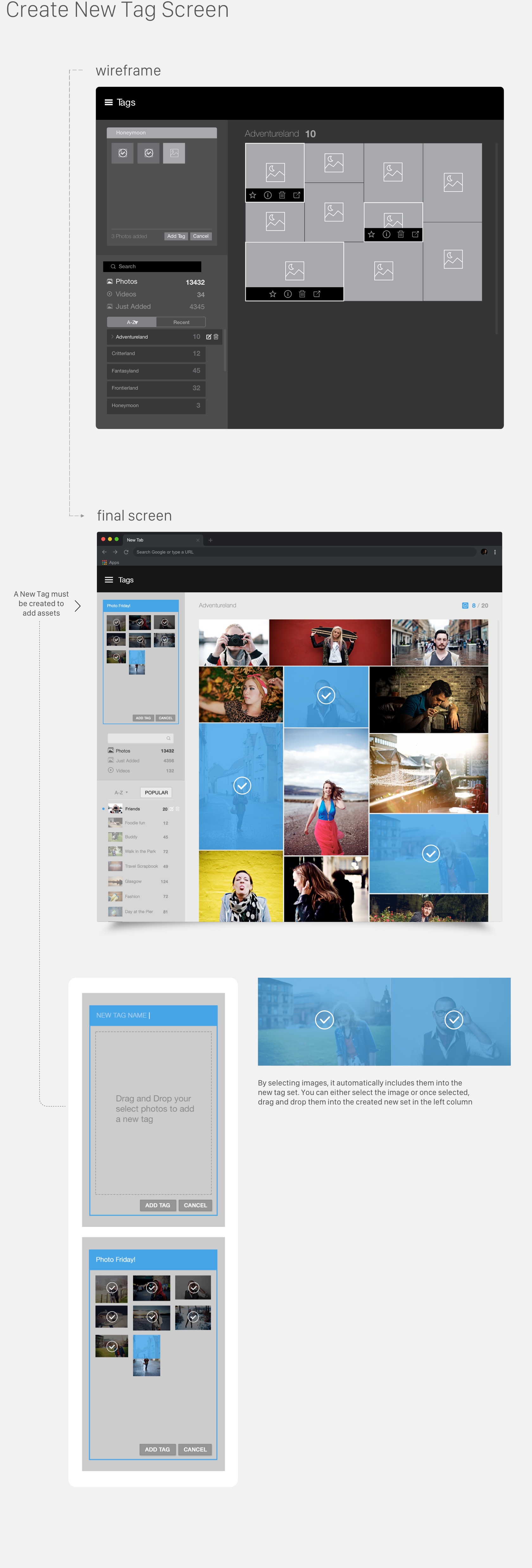 The LyveMinds WebApp works in combination with the mobile application to add, sync, and categorize photos that are added to a users album. For this purpose, we wanted to create a tag section where users can add tags to each photo or sets of photos. You can create tags, edit, transfer and delete tags accordingly. The goal was to update the look and add a fresh approach to tagging.