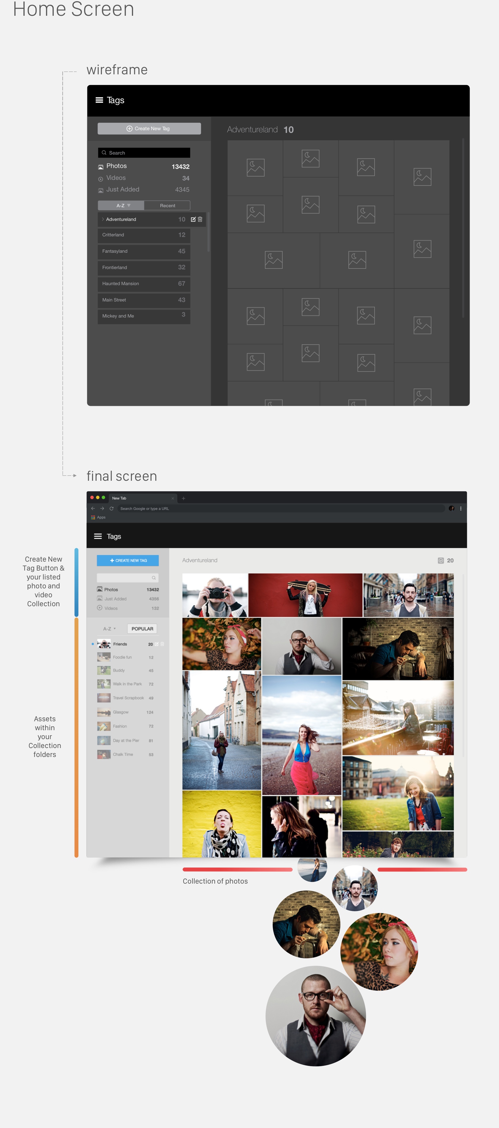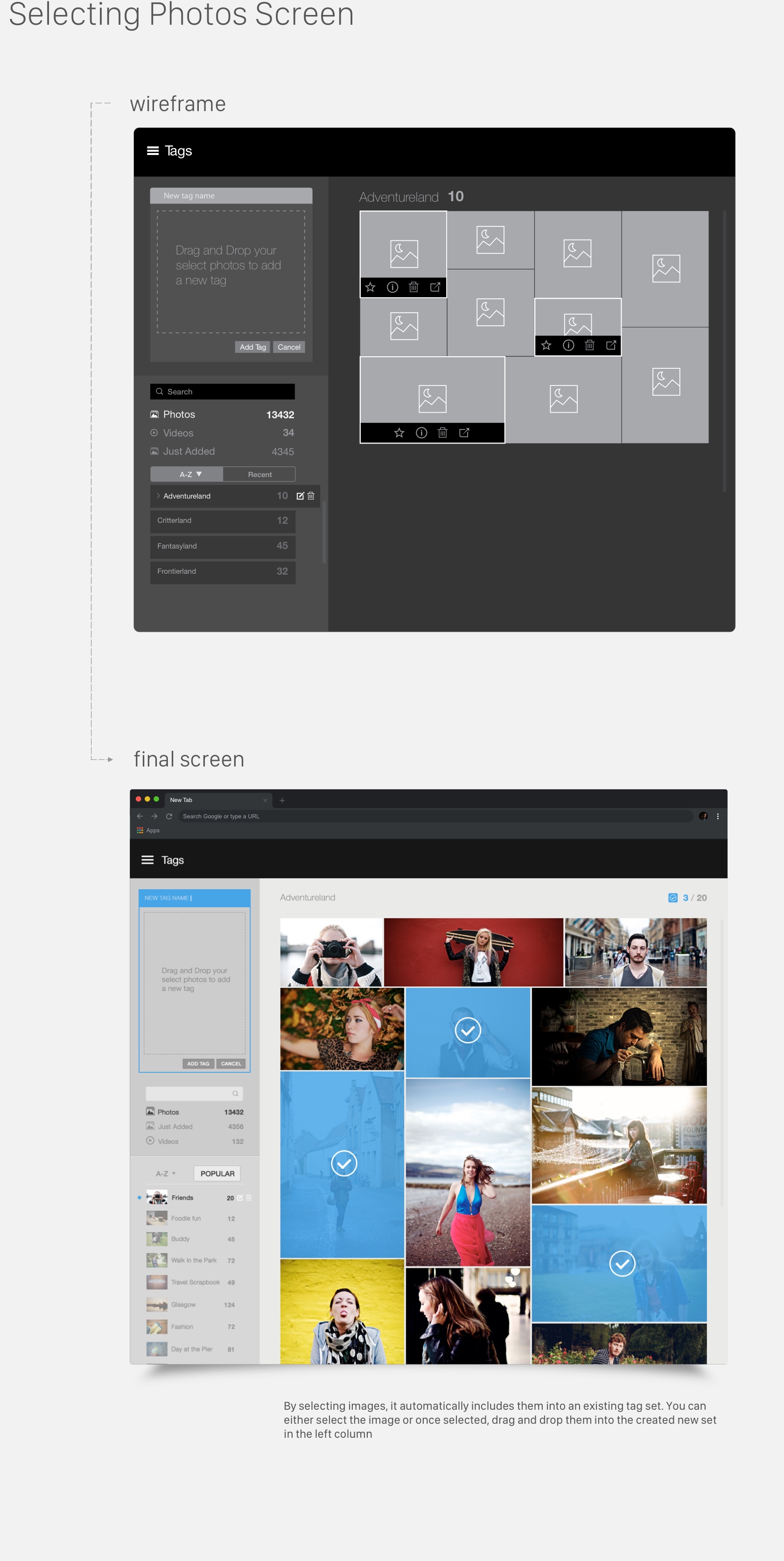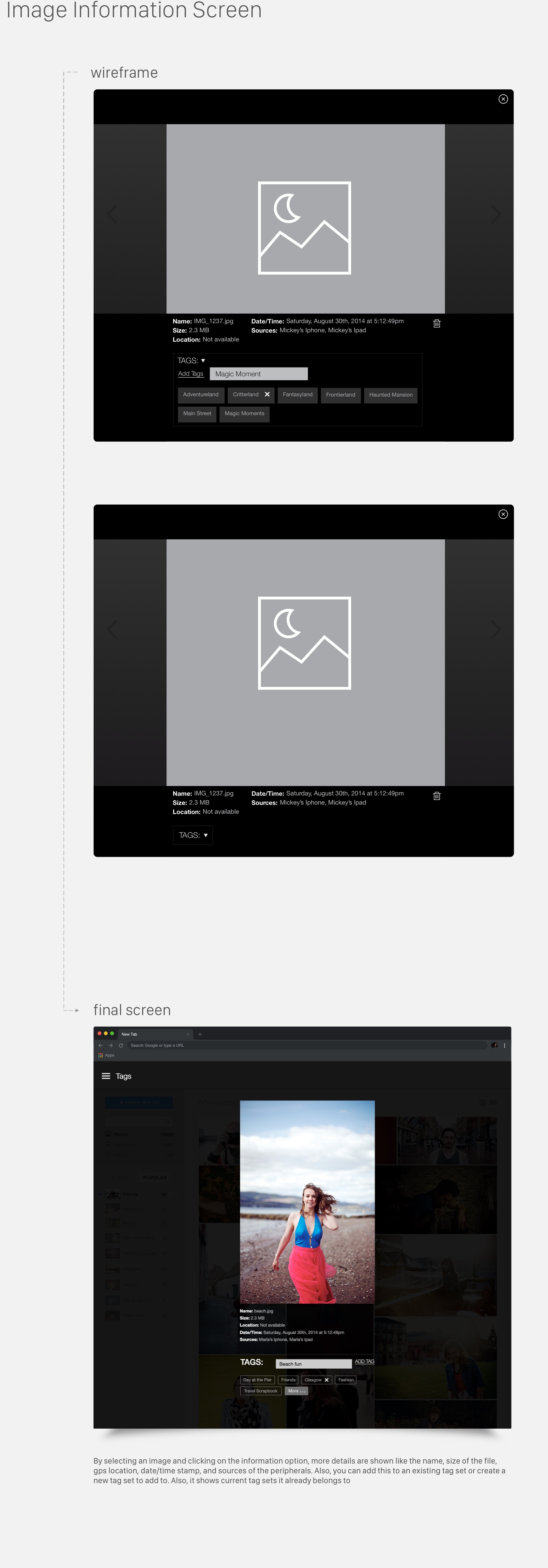 The LyveMinds WebApp works in combination with the mobile application to add, sync, and categorize photos that are added to a users album. For this purpose, we wanted to create a tag section where users can add tags to each photo or sets of photos. You can create tags, edit, transfer and delete tags accordingly. The goal was to update the look and add a fresh approach to tagging.
