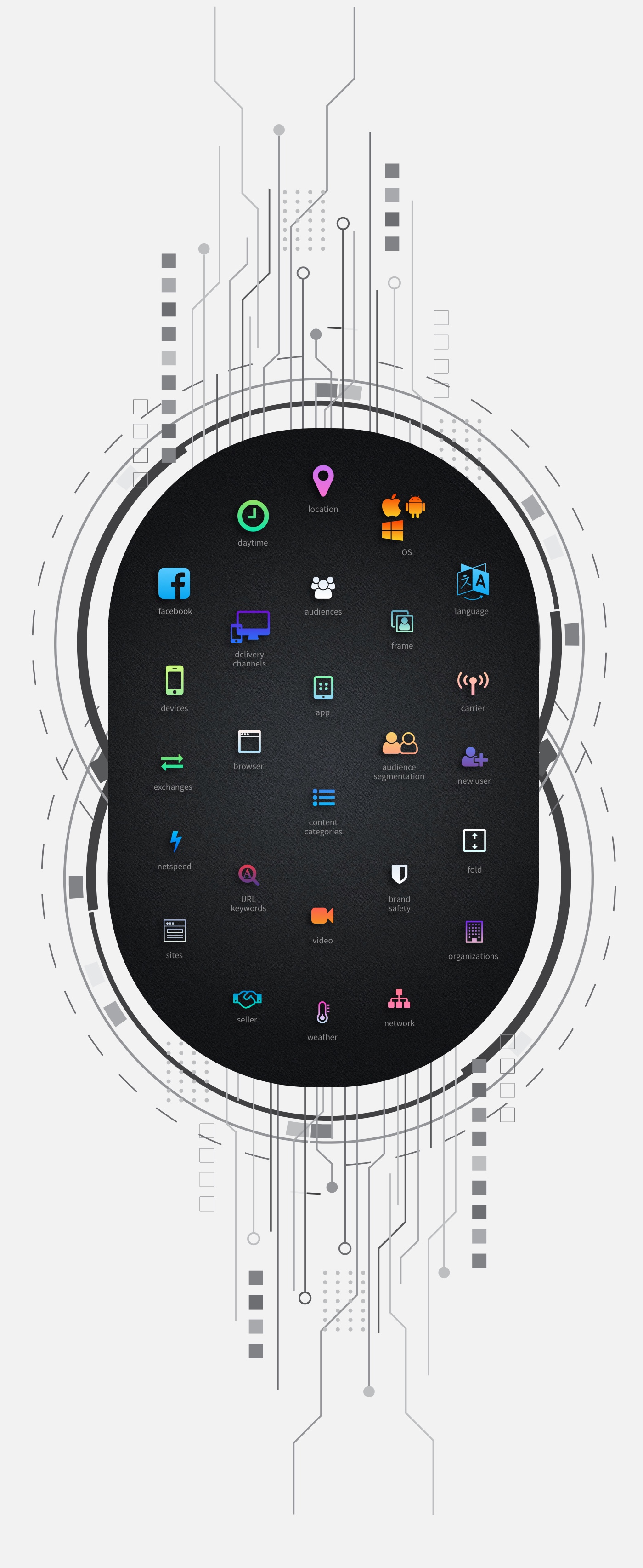 Rocket Fuel's leading marketing platform uses artificial intelligence (AI) at Big Data scale to optimize marketing ROI for global agencies and enterprise marketers. By leveraging the industry’s first AI-based cross-device optimization capability, marketers can now deliver targeted campaign messages to individuals across devices to drive higher performance lift. The icons were designed to give a clear and direct visual cue for the different categories in targeting.