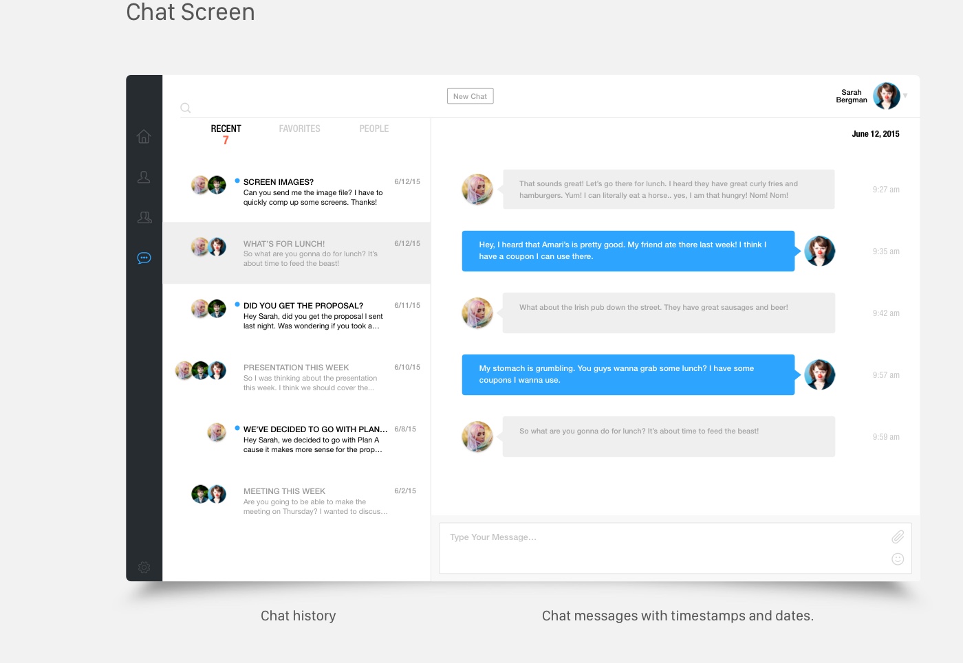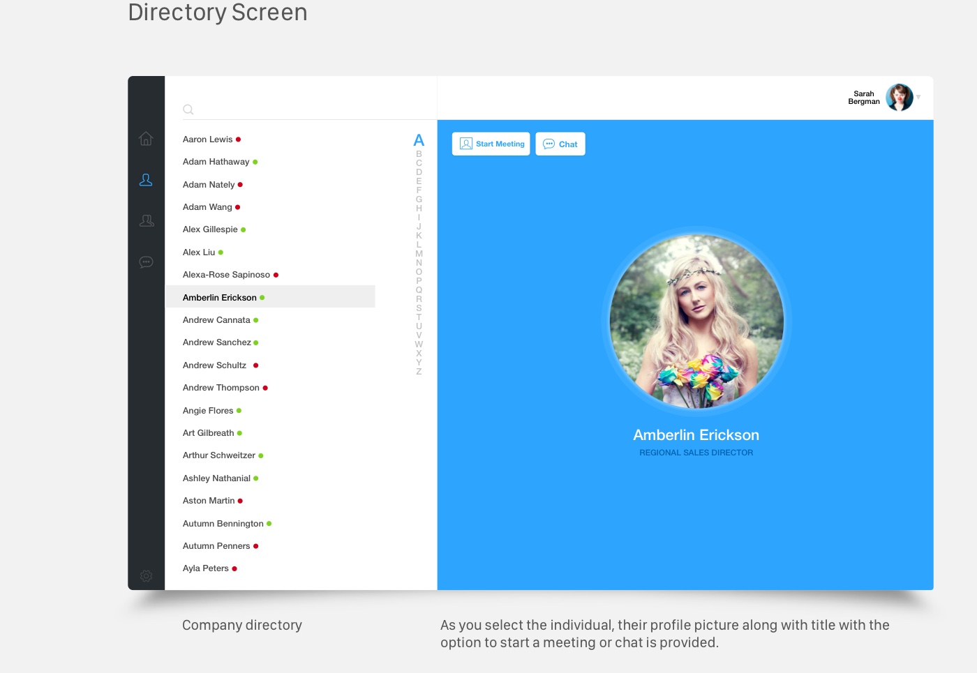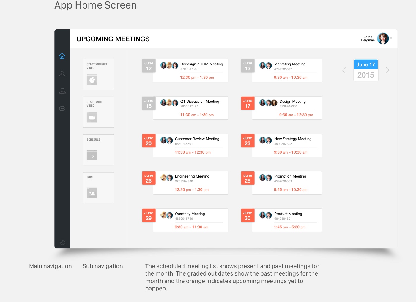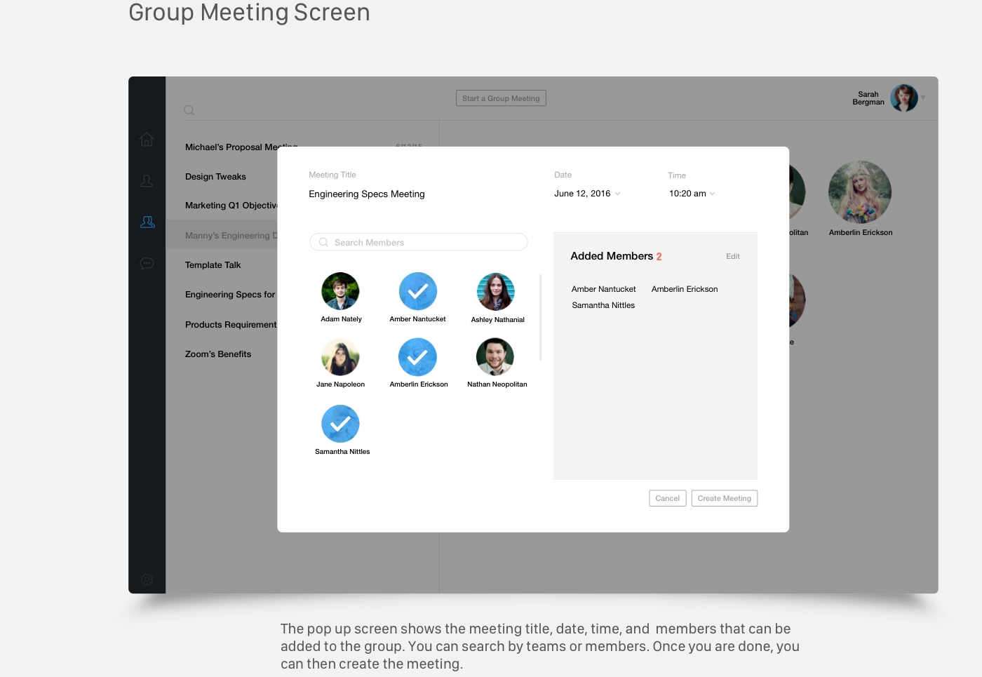 The Zoom Web Conferencing App is targeted towards small to large businesses. It tracks multiple sessions of meetings throughout the day, which is displayed in the home screen. You can also have individual meetings or group meetings depending on the need. The chat feature is a quick way to have a conversation with other members outside the meeting environment. Overall, the original intent of the UI was to streamline and design a clean way to communicate with other members no matter where you are.