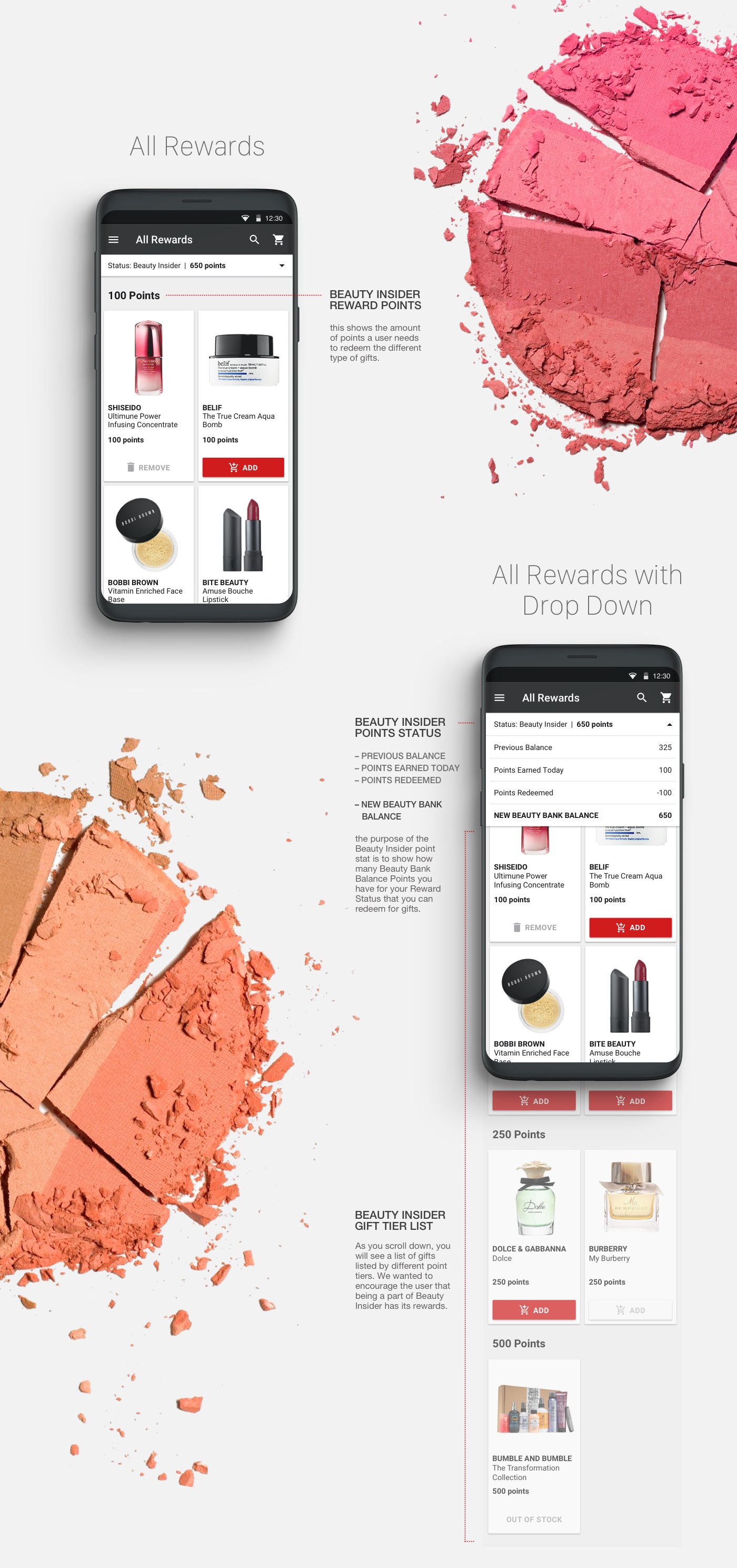 As a Beauty Insider Rewards Program member, you get to see your Daily Rewards, a Brand Spotlight and a list of all your other rewards that you can claim as a valued member at Sephora. The design was to showcase the products while giving it some emotion to the design. I also included additional screens that were designed coinciding with the Rewards screens.